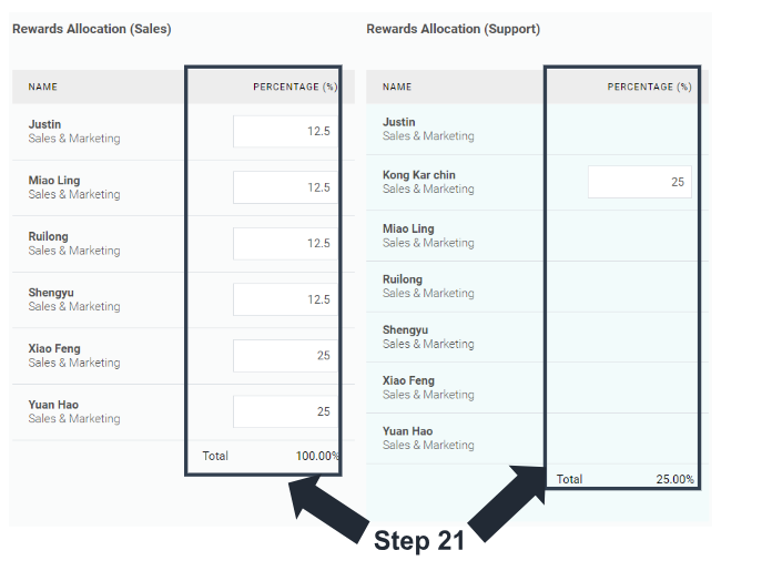 Step 21: Rewards Allocation (Sales)Ā š”ŖĀ Set the PERCENTAGE (%)Ā of each employee š”ŖĀ Rewards Allocation (Support)Ā š”ŖĀ Set the PERCENTAGES (%)Ā of each employee.Ā
