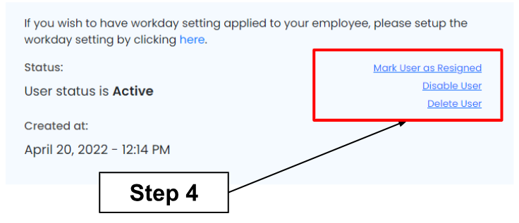Step 4: There are 3 types of status. Click “Mark User as Resigned” or “Disable User” or “Delete User”.